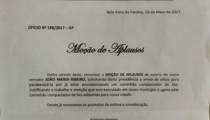 A deputada estadual cantora Mara Lima (PSDB) foi surpreendida essa semana por uma Moção de Aplausos, de autoria do vereador João Maria Ribeiro, conhecido como João do Barro, do municÃpio de Bela Vista do ParaÃso, por ter providenciado um caminhão compactador de lixo.