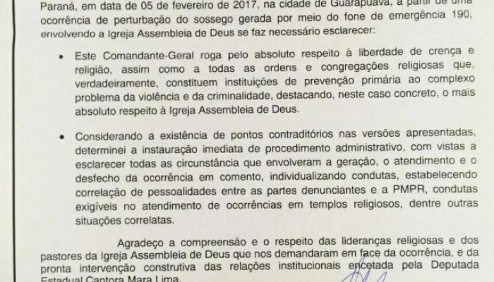 O Comandante-Geral da Policia Militar do Paraná, Maurício Tortato enviou, nesta quinta-feira (09/02), uma Nota de Esclarecimento para as lideranças da Igreja Assembleia de Deus, representada neste caso pelo nosso Presidente da CIEADEP, Pastor Perci Fontoura e a representante oficial da igreja na Assembleia Legislativa