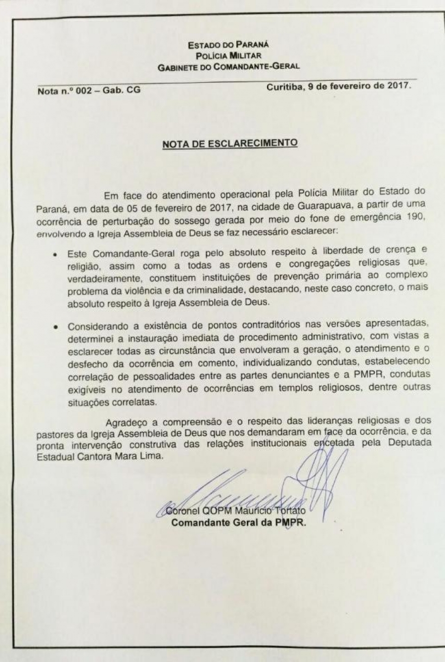 O Comandante-Geral da Policia Militar do Paraná, Maurício Tortato enviou, nesta quinta-feira (09/02), uma Nota de Esclarecimento para as lideranças da Igreja Assembleia de Deus, representada neste caso pelo nosso Presidente da CIEADEP, Pastor Perci Fontoura e a representante oficial da igreja na Assembleia Legislativa do Paraná, Deputada Cantora Mara Lima.