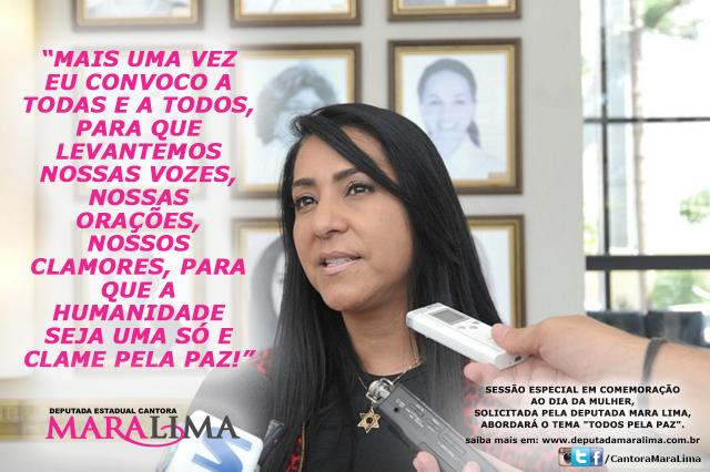 O tema escolhido e sugerido pela Deputada Mara Lima para esse ano, aprovado pelos integrantes da Comissão da Mulher, "TODOS PELA PAZ" - tem por objetivo sensibilizar a todos pela não violência. Segundo a Deputada esta é uma data para se comemorar e também para se conscientizar: "Hoje, vamos homenagear algumas mulheres que apoiam a luta constante de Combate à Violência contra a Mulher. Além de homenagear queremos sensibilizar a todos e alertar, pois, a violência se manifesta de várias maneiras: em guerras, torturas, conflitos étnico-religiosos, preconceito, assassinato, fome, diferença salarial, intolerância, entre outras", disse a Deputada que concluiu, "Por isso, mais uma vez eu convoco a todas e a todos, para que levantemos nossas vozes, nossas orações, nossos clamores, para que a humanidade seja uma só e clame pela Paz".