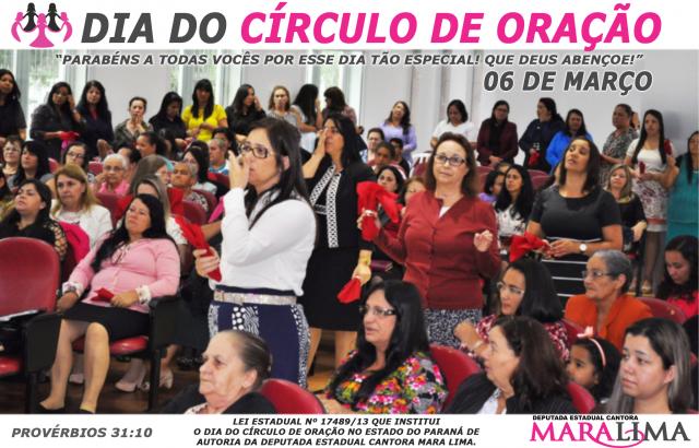 O dia do Círculo de Oração faz parte do calendário oficial do Estado e deve ser comemorado anualmente, no dia 06 de março, conforme Lei Estadual N°. 17489/13 de autoria da Deputada Cantora Mara Lima. 👏