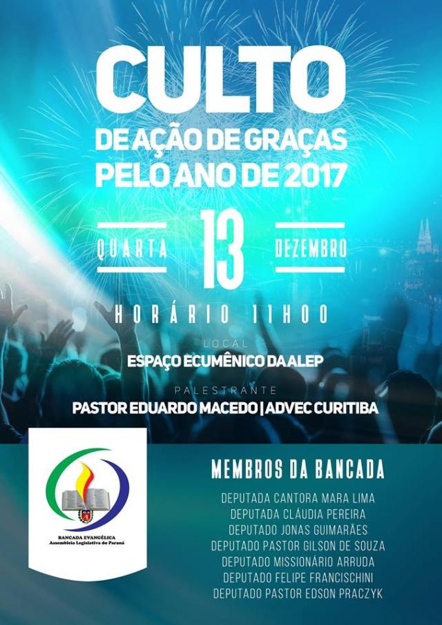 Para encerrar o ano, a deputada estadual cantora Mara Lima irá realizar um culto em Ação de Graças pelo Ano Legislativo de 2017 que será celebrado no Espaço Ecumênico da Assembleia Legislativa do Paraná (Alep) na próxima quarta-feira (13), às 11 horas. O culto terá como preletor o pastor Eduardo Macedo, da Igreja Assembleia de Deus Vitória em Cristo - ADVEC Curitiba.