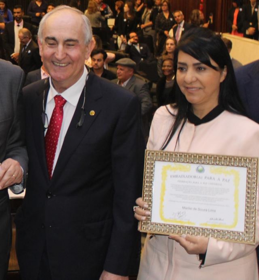 Na noite desta segunda-feira (14/05), a deputada estadual cantora Mara Lima (PSC) recebeu o Título de Embaixadora da Paz, em Sessão Solene na Assembleia Legislativa do Paraná. “Recebo esta honraria com profunda gratidão e grande humildade. Trata-se de um título que fala às nossas mais elevadas aspirações e dispõe que, apesar de todas as crueldades e dificuldades de nosso mundo, não somos simples prisioneiros do destino. Nossas ações fazem a diferença, e podem fazer com que a história se incline na direção da justiça”, agradece a parlamentar.