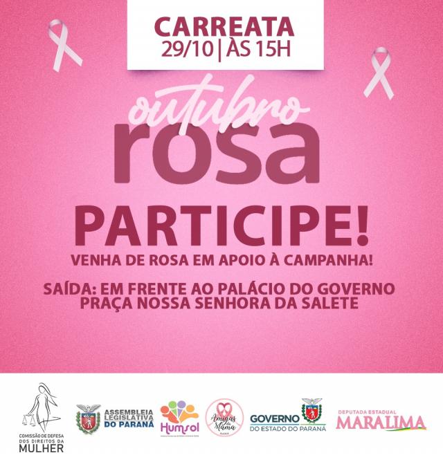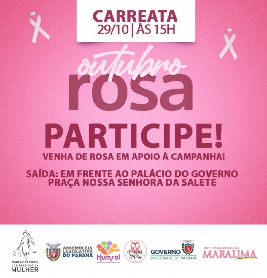 Levantamento feito pela Fundação do Câncer, com base em dados do Sistema Único de Saúde (SUS), revela queda de 84% no número de mamografias feitas no Brasil durante a pandemia do novo coronavírus, em comparação ao mesmo período do ano passado. Com o intuito de conscientizar as mulheres sobre a importância da prevenção e do diagnóstico precoce do câncer de mama, mesmo em tempo de pandemia, a Presidente da Comissão de Defesa dos Direitos da Mulher da Assembleia Legislativa o Paraná e autora da Lei nº 16.935/11, que instituiu a Campanha Outubro Rosa no Estado do Paraná, Deputada Estadual Cantora Mara Lima (PSC), irá realizar uma carreata, no dia 29 de Outubro, às 15h, com saída na Praça Nossa Senhora de Sallete, para encerrar a campanha e alertar a população da importância de fazer os exames preventivos.