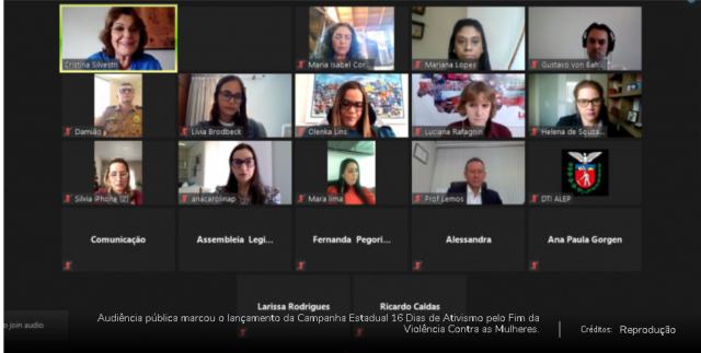 A Presidente da Comissão de Defesa dos Direitos da Mulher da Assembleia Legislativa do Paraná, deputada estadual cantora Mara Lima, participou da audiência pública, que teve o objetivo de debater, entre outros assuntos, a posição da mulher em julgamentos, com perspectiva de gênero e raça, que marcou a abertura da campanha dos 16 Dias de Ativismo pelo Fim da Violência Contra as Mulheres, lei nº 20.234/2020 sancionada em 2020, onde a parlamentar é co-autora.