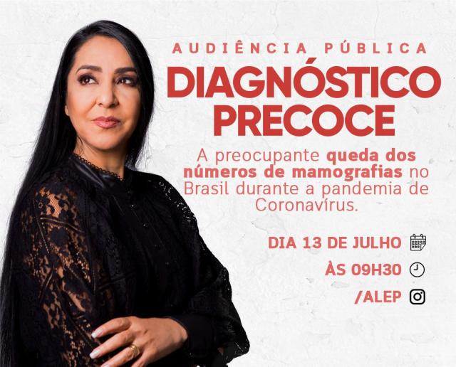 A Presidente da Comissão de Defesa dos Direitos da Mulher da Assembleia Legislativa do Paraná, Deputada Estadual Cantora Mara Lima, irá realizar Audiência Pública, com transmissão pela TV Assembleia e redes sociais do Legislativo Paranaense, no dia 13 de julho de 2021, a partir das 09h30 por videoconferência, com o tema "Diagnóstico Precoce - A preocupante queda dos números de mamografias no Brasil durante a pandemia de Coronavírus.".